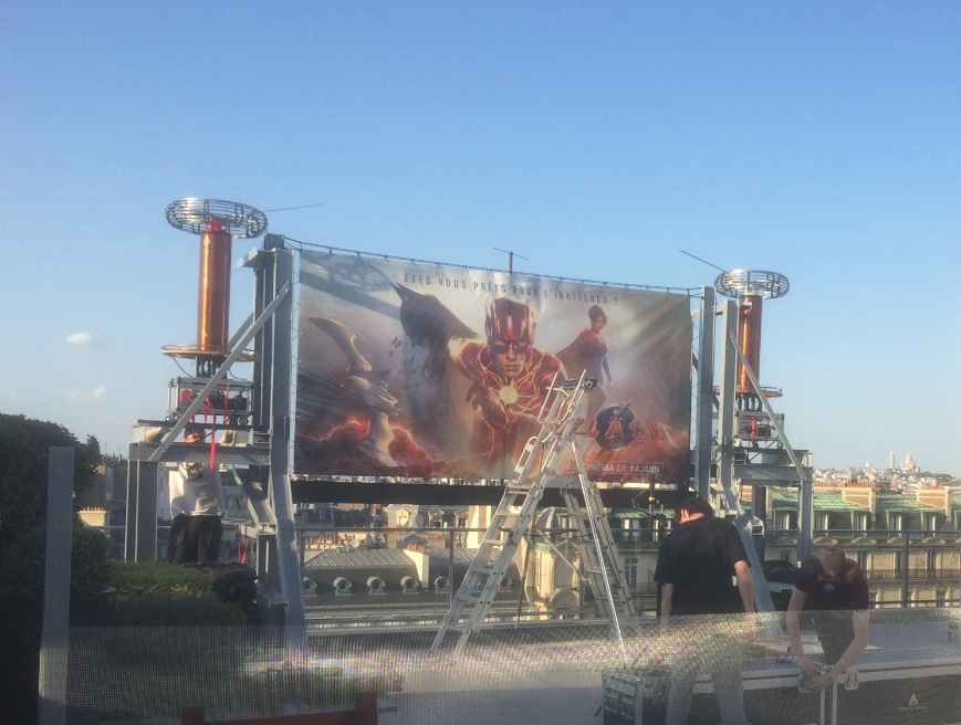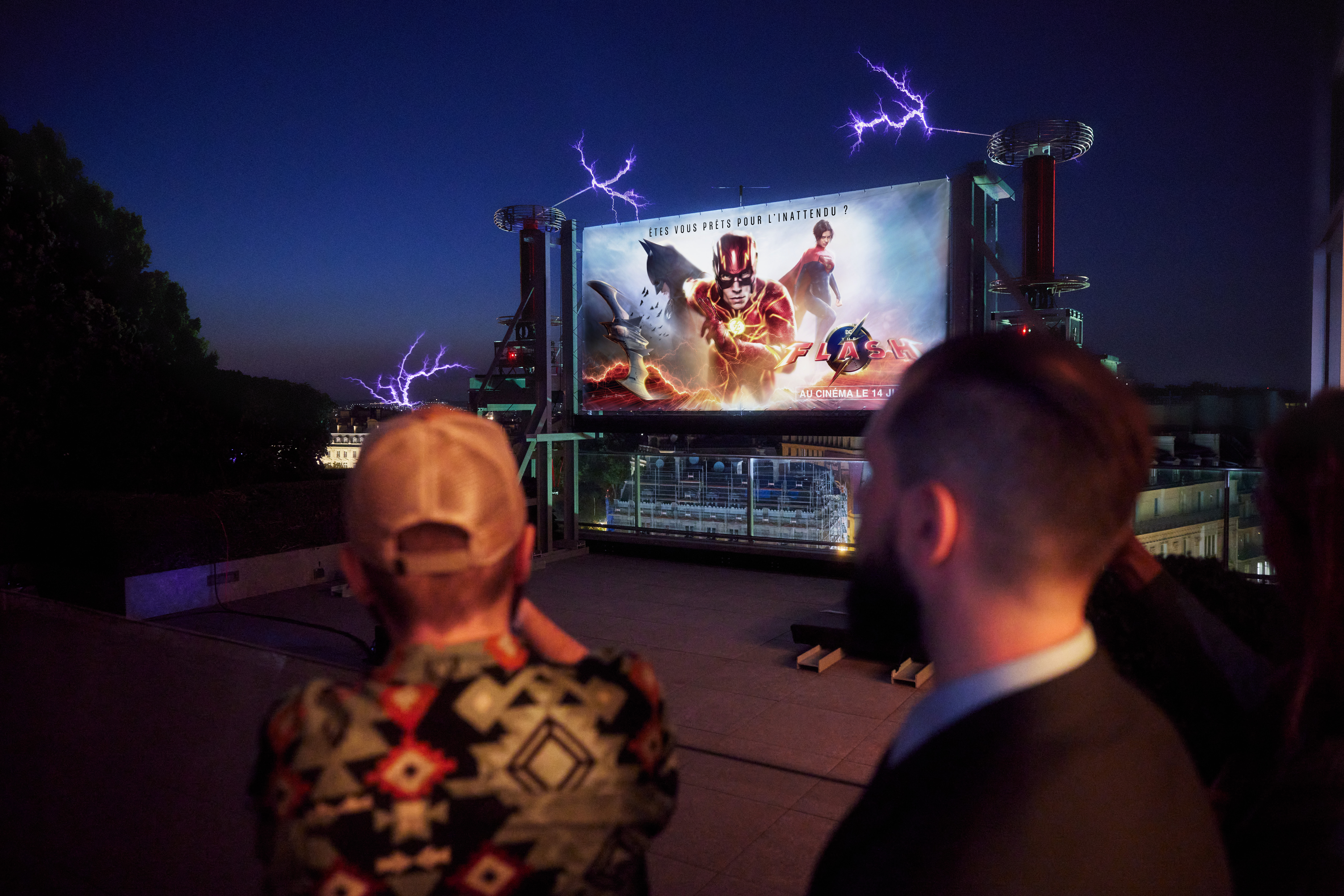 Une structure sur mesure équipée de Tesla coils générant des arcs électriques de 2,5 millions de volts chacun, formant un ballet lumineux de 5 mètres au-dessus de l’affiche géante de The Flash. Ce spectacle visuel, à la fois grandiose et symbolique, a capturé l’essence du film, incarnant la vitesse et l’énergie du super-héros.